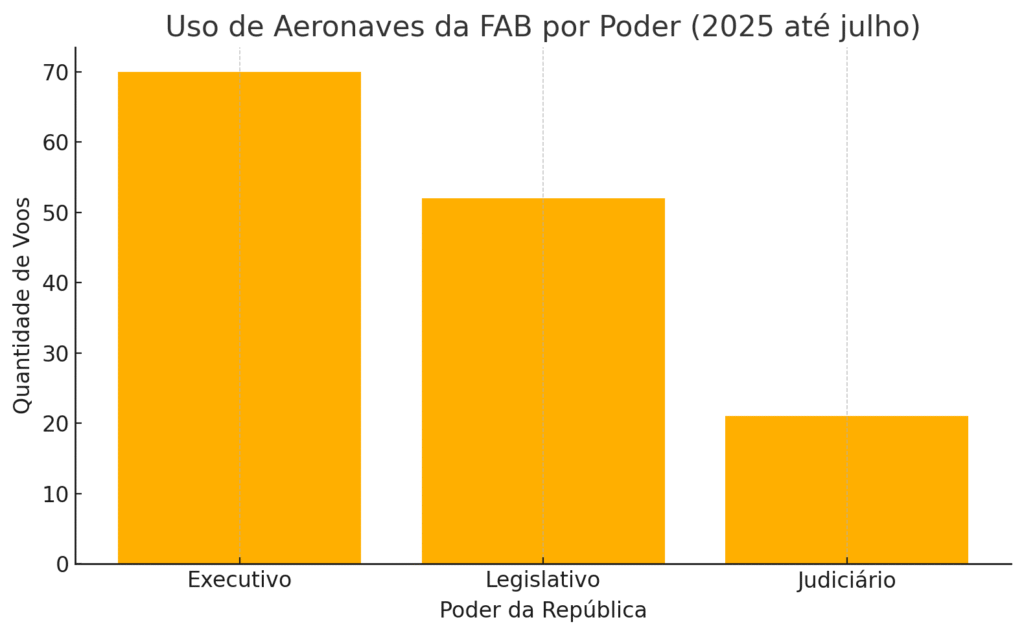 Dados parciais de 2025 indicam que o uso das aeronaves da FAB segue intenso por parte dos Três Poderes. Somente até julho deste ano, o Poder Executivo realizou cerca de 70 voos, o Legislativo 52 e o Judiciário 21, totalizando 143 deslocamentos oficiais. O gráfico abaixo ilustra esse cenário:
