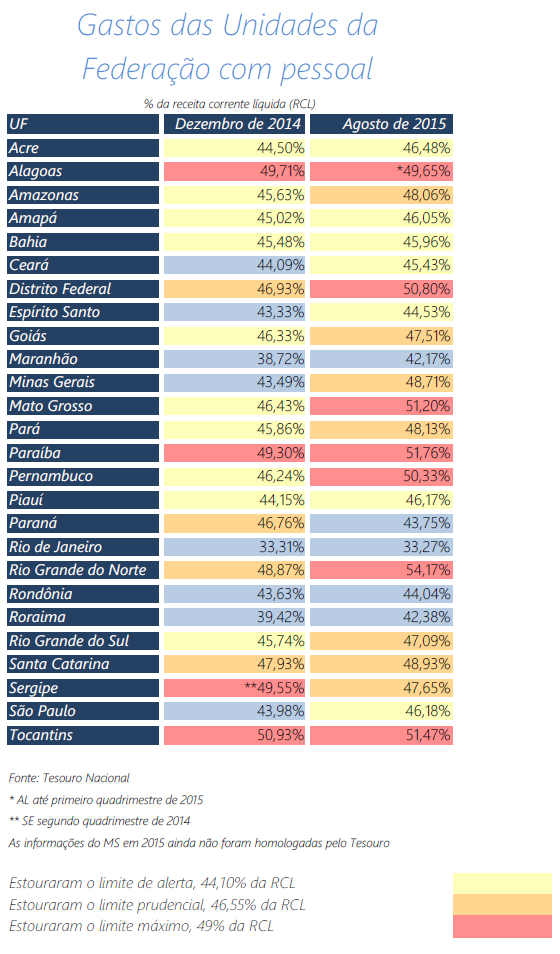 Os números mostram a deterioração das contas estaduais nos últimos meses. Em dezembro de 2014, apenas Alagoas, a Paraíba, Sergipe e o Tocantins ultrapassavam o limite máximo. o Distrito Federal, Paraná, Rio Grande do Norte e Santa Catarina tinham estourado o limite prudencial. o Acre, Amapá, Amazonas, a Bahia, Goiás, Mato Grosso, o Pará, Pernambuco, o Piauí e Rio Grande do Sul estavam acima do limite de alerta. A maior alta ocorreu no Rio Grande do Norte, cujos gastos com o funcionalismo saltaram de 48,87% (acima do limite prudencial) no fim de 2014 para 54,17% (acima do limite máximo) em agosto deste ano.