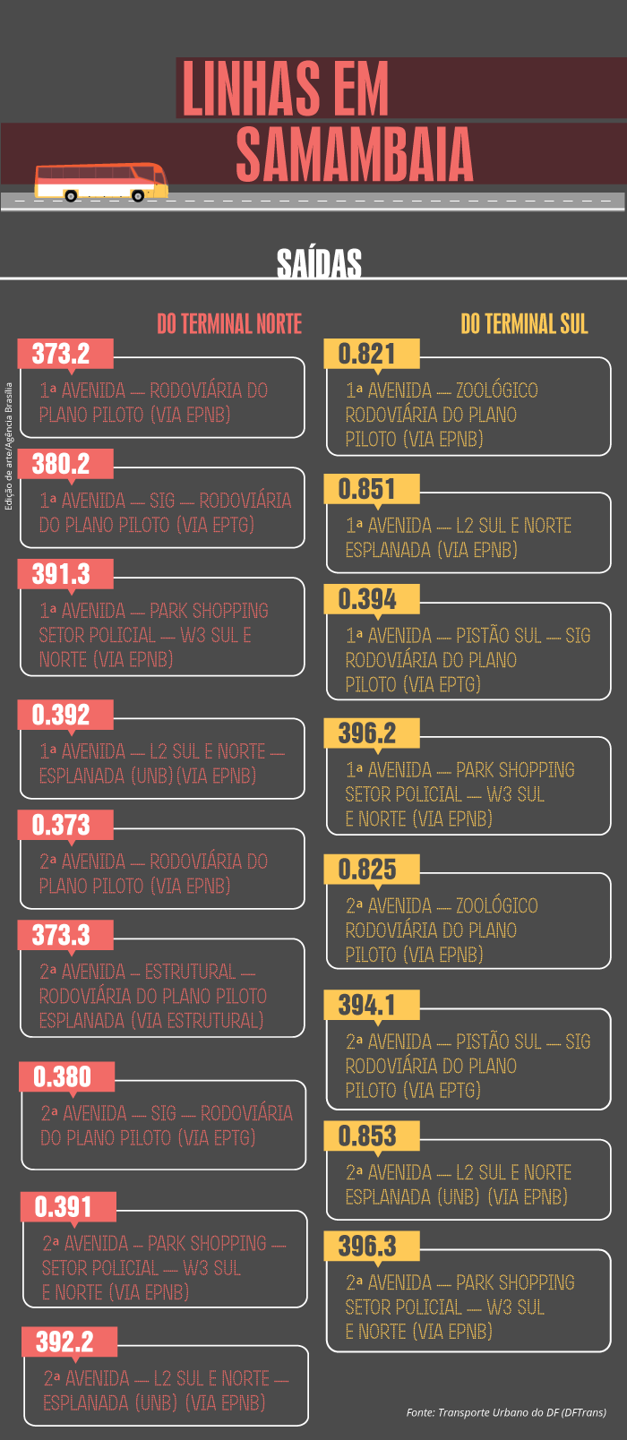 Resultado de ação conjunta da Secretaria de Mobilidade, da operadora Urbi e do Transporte Público do Distrito Federal (DFTrans), a mudança, acredita o secretário Carlos Tomé, trará vários benefícios: maior número de viagens, menos tempo de espera nas paradas e percursos mais rápidos. “Os itinerários se sobrepunham, ou seja, a prestação do serviço não era tão racional”, explica o titular da pasta.